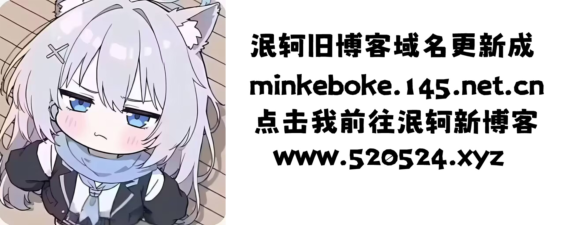 扣扣:3589067134 微信:hina3589067134 哔哩哔哩:泯轲 本人的网站 个人网站:http://minke233.github.io 个人博客:http://kz.mk 虚拟ICP备案:http://annno.cn 本人的QQ群 1群:622644162 2群:139968186 3群:743396350 非常感谢大家来关注我!!!( ̄▽ ̄) EN I'm lazy......wait!
